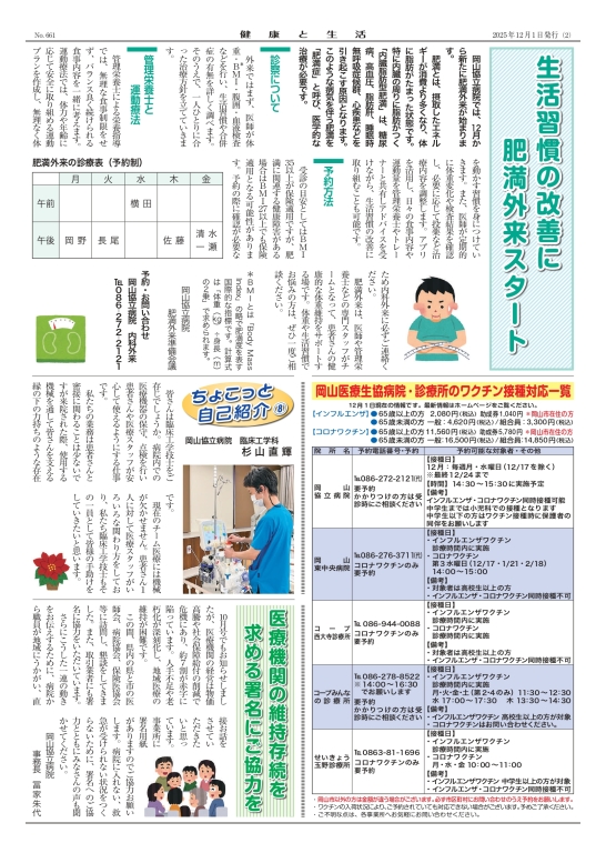 岡山協立病院では、12月から新たに肥満外来が始まります。肥満とは、摂取したエネルギーが消費より多くなり、体に脂肪がたまった状態です。特に内臓の周りに脂肪がつく「内臓脂肪型肥満」は、糖尿病、高血圧、脂肪肝、睡眠時無呼吸症候群、心疾患などを引き起こす原因となります。このような病気を伴う肥満を「肥満症」と呼び、医学的な治療が必要です。12月号の健康と生活は、岡山協立病院肥満外来準備会議から、対象となる患者さん・診察について・今後の予約方法などについて説明します。詳しくは