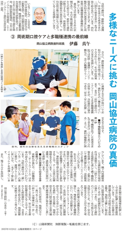 歯科の「周術期口腔ケアと多職種連携の最前線」について、山陽新聞Medicaに掲載されました。「岡山協立病院 病院歯科ならではの特徴」をご紹介いただいています。