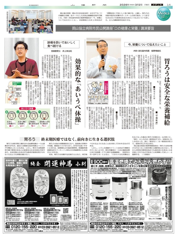 2025年2月7日(土)、岡山医療生活協同組合 Comcom会館にて、第5回市民公開講座「自分の口で、ながーく おいしく 食べよう」を開催しました。今回の講座では、「食欲が落ちてきた」「体重減少が気になる」「むせやすくなった」など、加齢とともに生じやすい食事や栄養、嚥下に関する悩みをテーマに、地域のみなさまに向けてわかりやすくお話ししました。講座の様子は山陽新聞Medicaにも掲載されました。ぜひご覧ください。