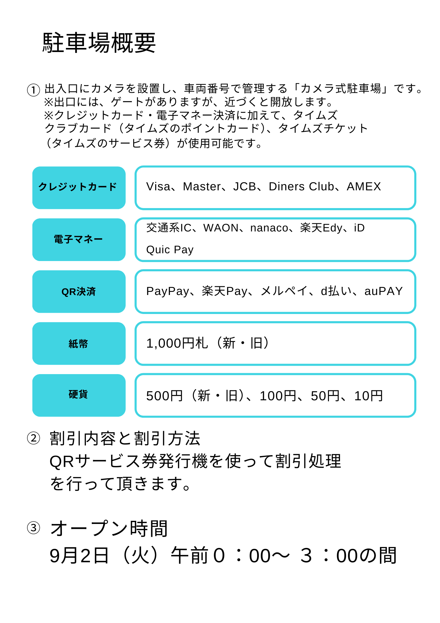 従来のゲート式システムから、カメラ式システム(車番認識)へ更新いたします。駐車券の発券が無くなり、スムーズな入出庫と利便性の向上を図ります。利用者割引等はQRコードのサービス券を発行する形式となります。