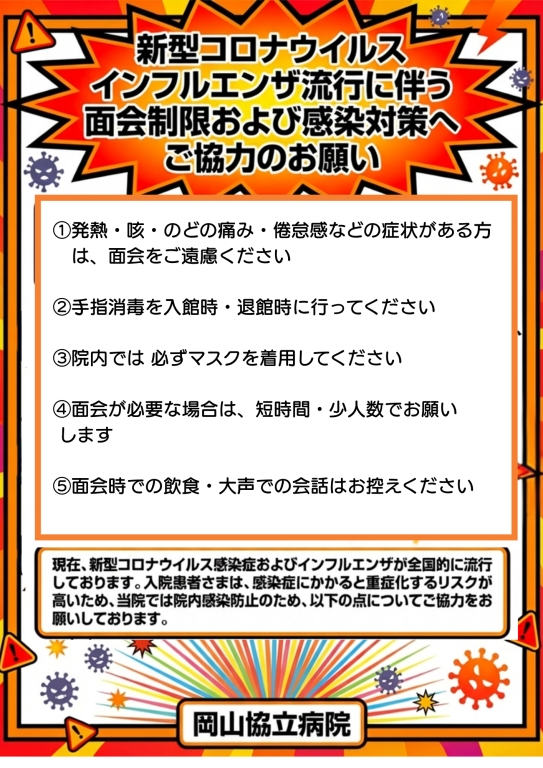 入院患者さんは感染症にかかると重症化するリスクが高いため、院内感染防止の観点から、面会に際して以下の点についてご理解とご協力をお願いいたします。
