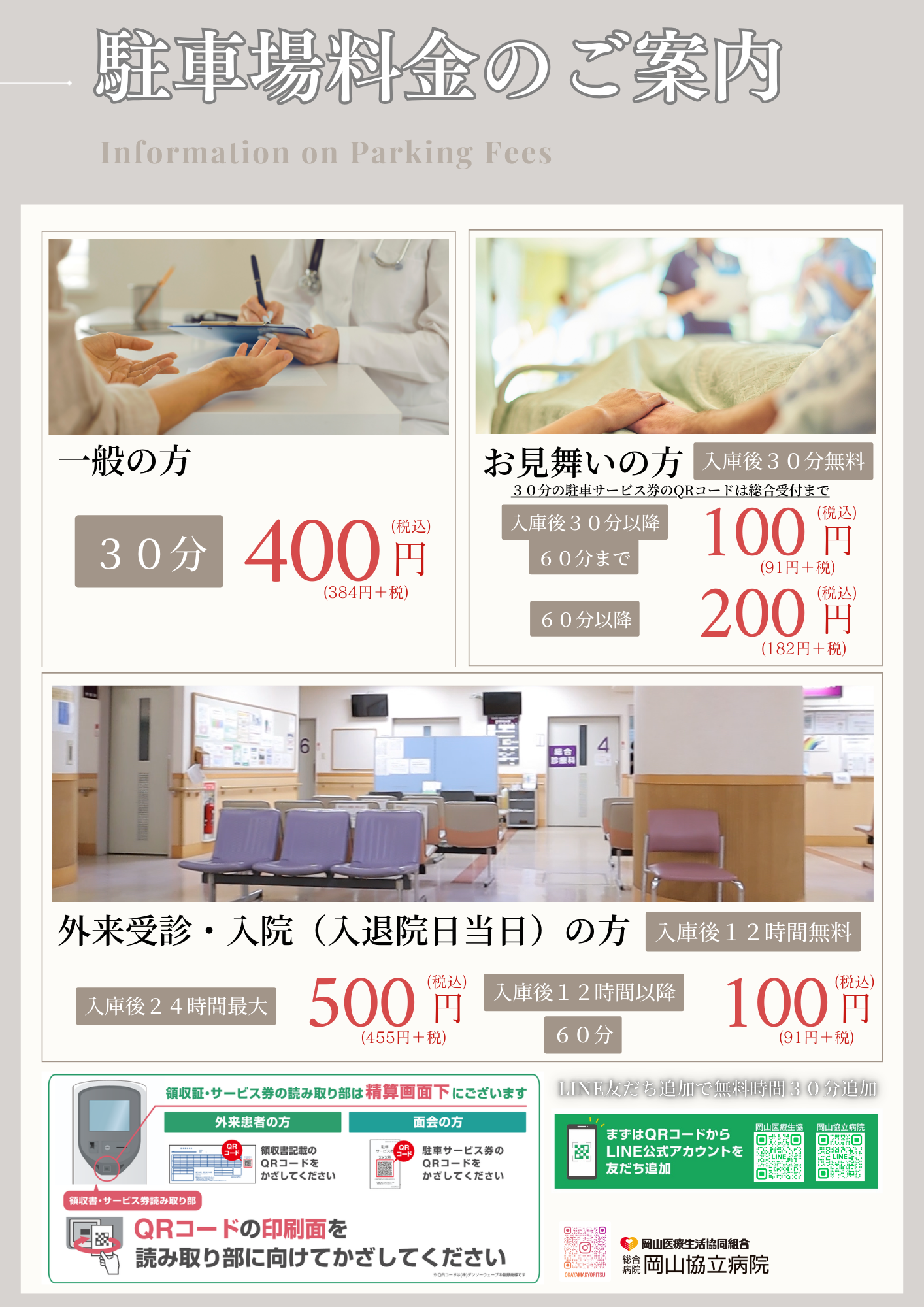 1階の総合受付でQR駐車サービス券をもらって、駐車精算機で処理をお願いします。