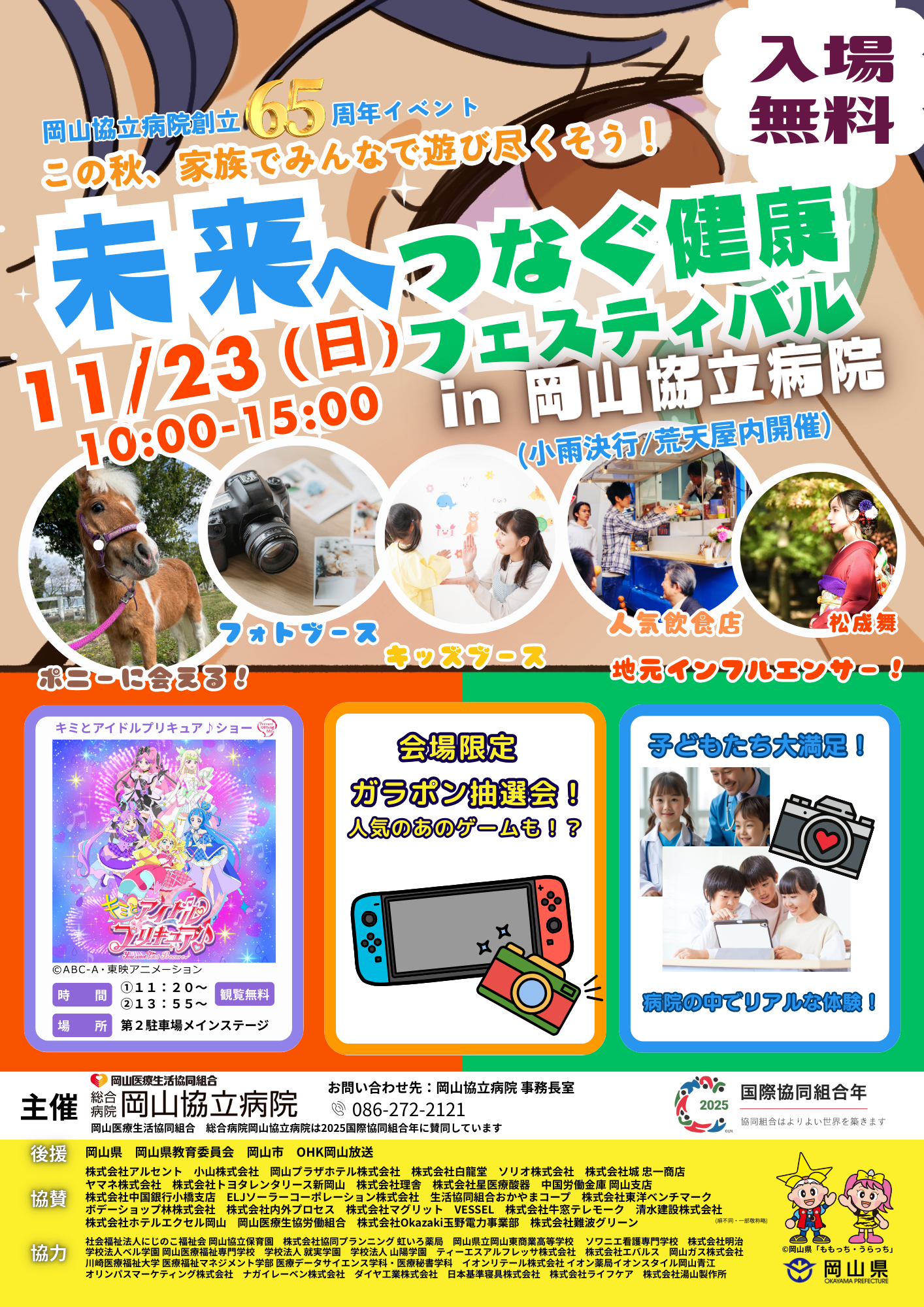 岡山協立病院主催で健康をテーマにしながら“遊べる・食べる・学べる”を全部楽しめる、地域最大級の健康フェスです。