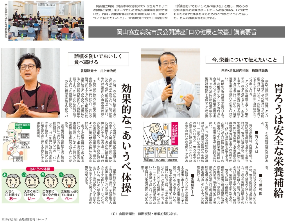 2025年2月7日(土)、岡山医療生活協同組合 Comcom会館にて、第5回市民公開講座「自分の口で、ながーく おいしく 食べよう」を開催しました。今回の講座では、「食欲が落ちてきた」「体重減少が気になる」「むせやすくなった」など、加齢とともに生じやすい食事や栄養、嚥下に関する悩みをテーマに、地域のみなさまに向けてわかりやすくお話ししました。講座の様子は山陽新聞Medicaにも掲載されました。ぜひご覧ください。